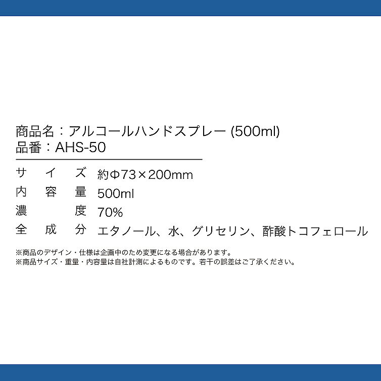 【商品詳細】 サイズ:約7.3×7.3×20=34.6cm 内容量:500ml 成分:水、エタノール、グリセリン、酢酸トコフェロール アルコール濃度:70% 用途:手指 マスク 携帯 衣服 部屋 社内等 ※色落ちにご注意ください。